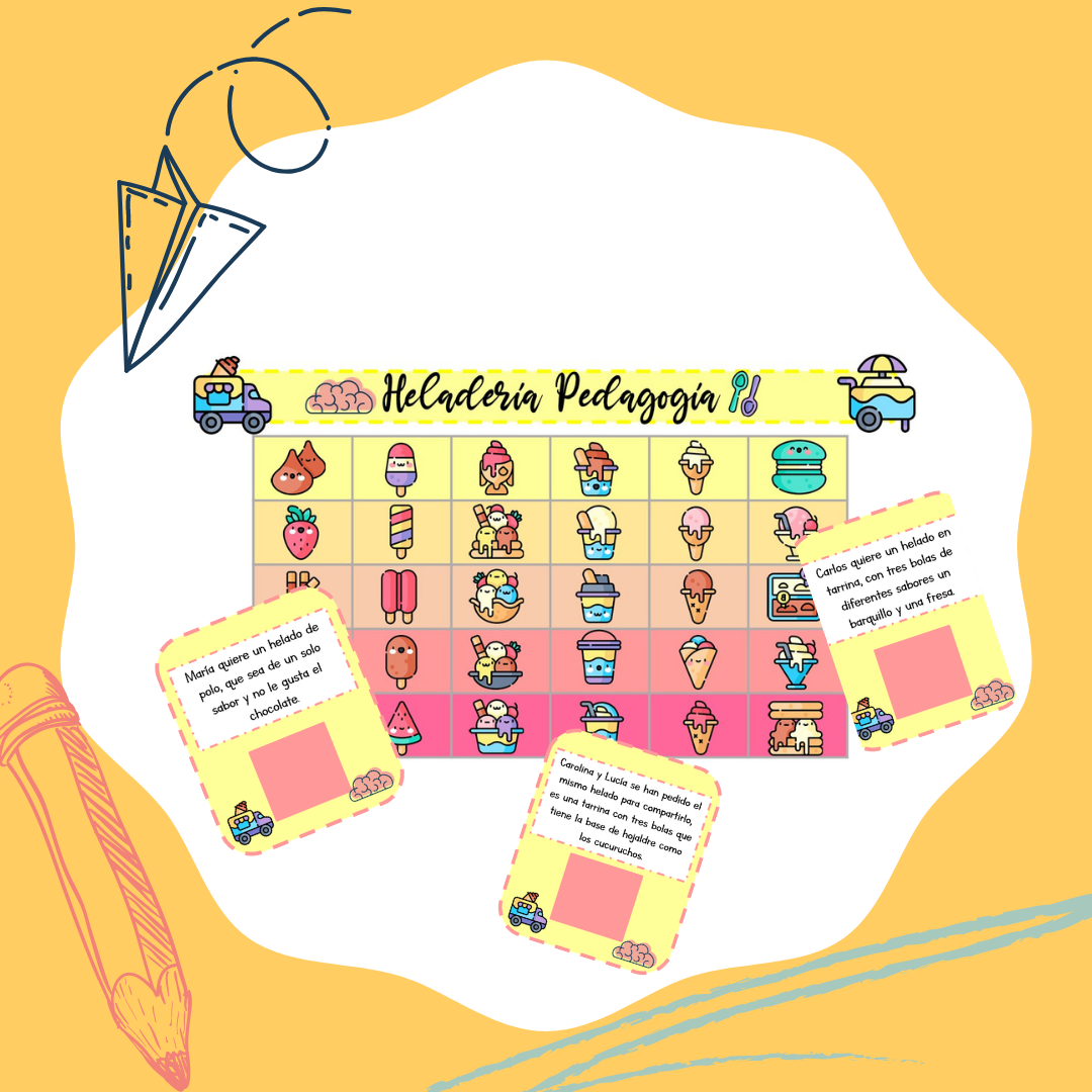 Con este recurso trabajaremos las funciones ejecutivas, seremos dueños de una heladería en la que tendremos que despachar lo que los clientes nos vayan solicitando, contaréis con un panel y multitud de tarjetas “cliente” para trabajar.